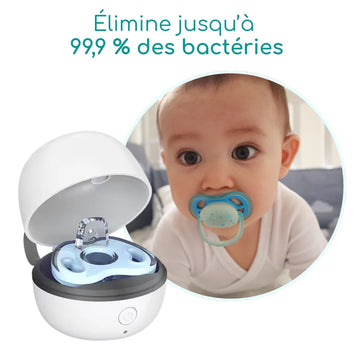 Il permet de stériliser en seulement 3 minutes n'importe quelle sucette. Sa technologie aux ultraviolets permet d'éliminer 99% des germes et bactéries.